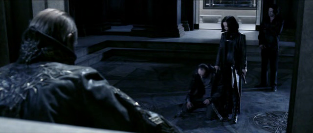 Thus ends the prologue and we come back to the present where once again, like in the first movie, we are welcomed by Selene’s monologue. I get the feeling that I’d prefer it if the movie had stayed the way it was in the prologue… Again, for those who haven’t seen the first movie, we are given flashbacks to what occurred in it. In 2 minutes she gives us a summary of a 2-hour-long movie and I have to say she does it accurately. Her quest now, as she informs us, is to awaken Marcus from hibernation and explain the situation to him before Kraven, our favourite cardboard character from the first movie gets to murder him while he’s still asleep. Along with Michael, she breaks into a vampire interrogation facility where they find a chained dead Lycan who’s supposedly been dead for weeks, yet shows no signs of decay. Sense? None. Also, Michael remarks that he thought Lycans came back to their human forms after death, which Selene agrees to, which is another piece of bullshit riht at the start of the movie, because nothing in the previous film showed us any proof they did – every fallen Lycan stayed in their werewolf form and did not change back. Great, 10 minutes into the movie and the plot’s already inconsistent…